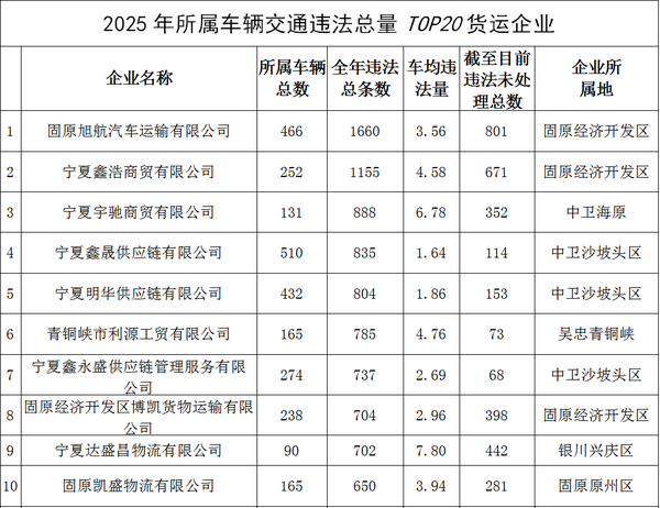 2026年春运在即,为进一步加强道路交通安全管理工作,全面加强客货运输企业和车辆的安全监管,宁夏公安厅交管总队梳理了2025年全区交通违法突出的20家货运企业以及20辆货运车辆予以集中曝光,督促企业落实安全管理主体责任,加强驾驶人交通安全教育管理,全力防范涉及货运车辆的交通事故。