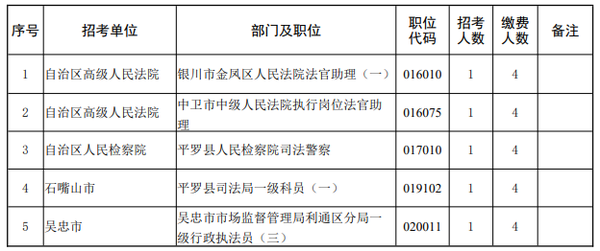 2026年全区考试录用公务员网上报名、资格初审及缴费工作结束后,有部分职位未达到笔试开考人数。根据《宁夏回族自治区2026年考试录用公务员公告》中“笔试开考人数(职位有效报名人数)一般为N+4(N为该职位招录名额);定向招录、专业性较强、生源较少的职位以及艰苦边远地区招录职位的开考人数可降至N+2;公安机关法医、特殊紧缺人才职位,检察机关法医、监狱机关狱医(戒毒场所医生)等专业性强职位的开考人数可降至N+1。达不到开考人数的职位,减少招考名额或取消招考计划。招考计划取消的,报考该职位的报考者可改报其他符合条件的职位”的规定,经研究,取消部分职位招考计划、降低部分职位笔试开考人数。具体如下: