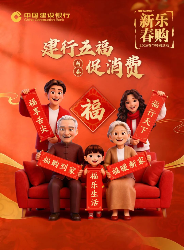 春节,是中华民族最重要的传统节日,也是传统的消费旺季。近日,商务部等9单位印发《2026“乐购新春”春节特别活动方案》,结合农历马年文化内涵与春节消费特点,以繁荣节日市场、丰富群众文化生活、激发假期消费活力。建设银行积极响应号召,围绕人民群众“好吃、好住、好行、好游、好购、好玩”核心需求,以“福享舌尖、福暖新家、福行天下、福购到家、福乐生活”为主题,在全国范围内策划开展“建行五福促消费”活动。