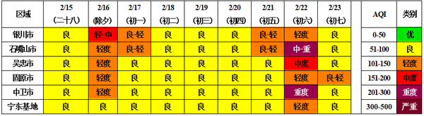 2月14日,记者从宁夏回族自治区生态环境厅获悉,结合最新气象条件及环境空气质量形势综合分析,2026年春节假期(2月15日至23日,腊月二十八至正月初七),全区空气污染扩散气象条件整体一般,空气质量以良至轻度污染为主,局地部分时段可能出现中度至重度污染,其中初六需重点防范沙尘天气。