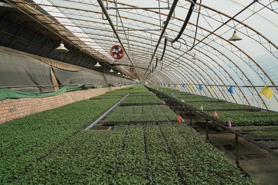 在温棚内,一排排育苗架整齐排列,西瓜、番茄、辣椒等多个品种的幼苗青翠欲滴,水肥一体化设备细细滴灌,工人们挑选种苗的操作行云流水。