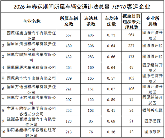 2026年春运自2月2日起至3月13日结束。为全面加强客货运输企业和车辆的安全监管,宁夏公安厅交管总队对今年春运期间全区客运企业交通违法情况进行全面梳理,筛选出交通违法总量排名前10的客运企业进行曝光,督促企业落实安全管理主体责任,加强驾驶人交通安全教育管理,严防发生涉及客运车辆的交通事故。