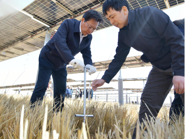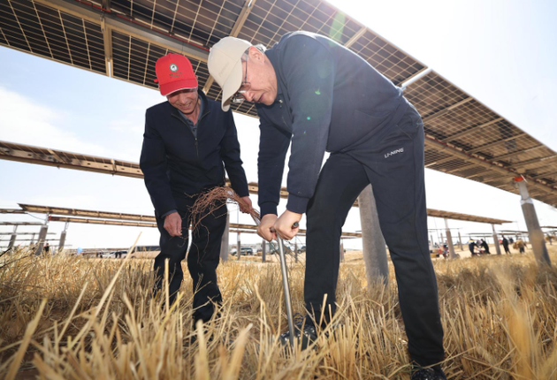 李邑飞、张雨浦、庄严一行前往沙坡头区腾格里沙漠中卫光伏大基地生态修复示范点、光伏治沙实证基地、光伏治沙片区,调研防沙治沙试点示范项目建设、光伏治沙创新技术实验和经济作物种植推广应用情况,听取黄河“几字弯”攻坚战和中卫市宁夏境内腾格里沙漠全面锁定行动进展汇报。李邑飞说,近年来宁夏生态环境持续改善、十分不易,必须下大气力巩固提升。要深刻领会习近平总书记在加强荒漠化综合防治和推进“三北”等重点生态工程建设座谈会上的重要讲话精神,坚持生态优先、绿色发展,聚力打赢黄河“几字弯”攻坚战,扎实开展宁夏腾格里沙漠全面锁定行动,筑牢西北地区重要生态安全屏障。要认真总结经验,统筹防沙治沙用沙,推广应用林光互补草光互补模式和“草方格+沙结皮”等技术,科学选择板下作物品种,一体推进土壤改良、集水利用、光伏发电、生态恢复,努力实现生态效益、经济效益和社会效益多赢。