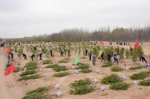 银川市苏银产业园片区义务植树活动现场。 宁夏日报记者 马赛尔 摄