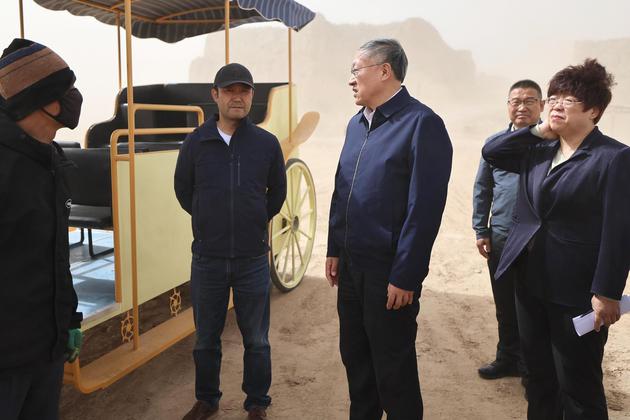李邑飞在水洞沟旅游景区沙枣湾,实地查看设施维护、人员疏导等情况。