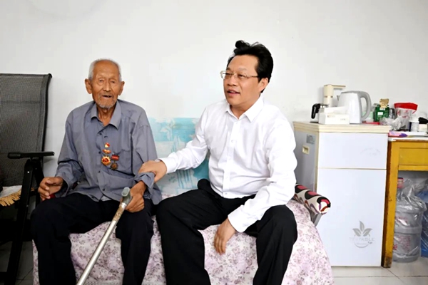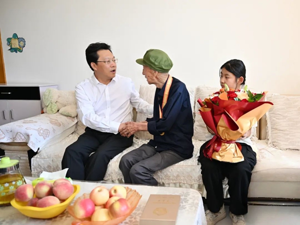 陈雍带队赴盐池县,先后到抗战老战士老同志孙占财、杭贵茂、候兴芳家中,为他们佩戴纪念章,一起拉家常、忆往昔,关切询问老人的生活起居、身体健康等情况,感谢老战士老同志为中国革命与建设事业、地方发展作出的重要贡献,叮嘱相关部门用心用情做好服务保障工作,切实把党和政府的关怀落到实处细处,让他们幸福安度晚年。