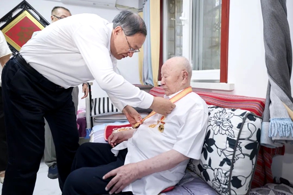 李邑飞在银川市看望慰问抗战老战士柴显忠,为老人佩戴“中国人民抗日战争胜利80周年”纪念章。宁夏日报记者 党硕 摄