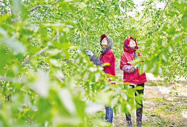 近日,位于灵武市的宁夏大秦枣产业专业合作社大棚内,工人手持高枝剪在为枣树抹芽。这一批温棚长枣正值坐果期,预计7月中旬成熟,比大地长枣提前2个月上市。据了解,灵武市设施长枣种植面积达1292亩,产量61.8万公斤,产值达1500余万元。 记者 王晓龙 白茹 摄