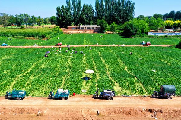 7月29日,银川市贺兰县金贵镇红星村蔬菜种植基地,采摘工人在采收,田间道路上运输车辆就绪。新鲜菜心及时装车外运,畅销粤港澳大湾区市场。“宁夏菜心”是国家农产品地理标志产品,贺兰县作为“宁夏菜心”的主产区,年产量达16.7万吨。该县从传统农业县向高端蔬菜供应基地转型,全县冷凉蔬菜总产值超21亿元,基本形成“四季不断档、常年有鲜菜”的供应格局。记者 王鼎 白茹 摄