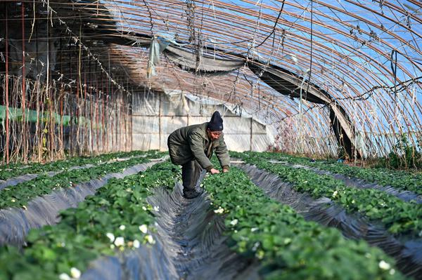 在蔡进平的大棚对面,常乐村村民王泽有正将保温被缓缓升起,让尚未开花结果的草莓苗沐浴阳光。“我在这儿租了7个大棚,其中这两棚种的是草莓。今年种得晚,现在刚开花,预计春节前后上市,价格应该也不错。”他边走边介绍,在一片已挂果的草莓垄前停下,兴奋地说:“这是今年试种的新品种‘盐莓一号’,果型好,口感酸甜适中,而且抗病性强。”