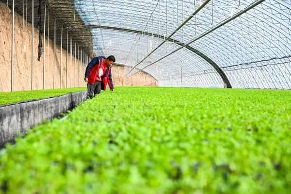 1月21日,位于中卫市沙坡头区柔远镇的丰盈先行农业科技有限公司育苗大棚内,技术员在查看种苗长势。近年来,该镇聚力发展设施农业,建成永久性蔬菜大棚2476栋,吸引金城种业、塞上江南、丰盈农业等10家育苗企业集聚,形成规模化种苗培育集群。目前,全镇年育苗量1.6亿株,占沙坡头区育苗总量的60%以上。宁夏日报报业集团全媒体记者 王强 摄