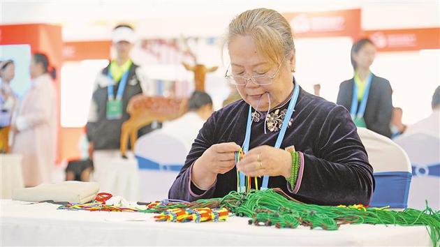 自治区非遗传承人刘亚明在展会现场制作绳编。