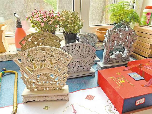 隆德县凤岭乡于河村的魏氏砖雕非遗展示馆内,砖雕的发簪、手串、摆件、茶具随处可见。“这些小玩意很受欢迎,这个荷花式样摆件,被银川的客人预订了;这套茶具还没完工,也被人预订了。”国家级非物质文化遗产传承人卜文俊告诉记者,砖雕原本主要用在古建筑屋顶上的雕花或者院墙里外的装饰。为了让它更亲民,卜文俊还把这项技艺用于文创产品。“我聘请了4名艺术类专业的大学毕业生,做文创产品的设计制作。”