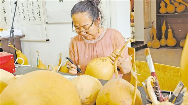 自治区级非遗传承人陶瑞珍进行葫芦刻画。