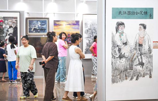 7月22日,“石榴结硕果 和美新时代”第三届民族地区优秀美术作品交流展(银川站)在银川市文化艺术馆二楼展厅开展,来自广西、宁夏、内蒙古、新疆以及西藏5个自治区的100幅美术精品,吸引了众多市民前往参观。本次展览以铸牢中华民族共同体意识为主线,紧扣民族团结、乡村振兴、城市建设、民俗风情等时代主题,生动描绘出新时代各民族地区经济社会发展的壮丽画卷,展览将持续至8月3日。记者 马楠 王洋 摄