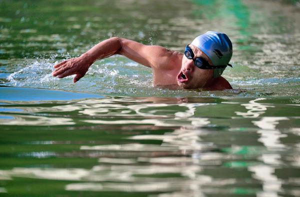 泳道中,冬泳健将们舒展四肢,或蛙泳稳健前行,或自由泳劈波斩浪,在湛蓝的湖水中划出一道道灵动的弧线。