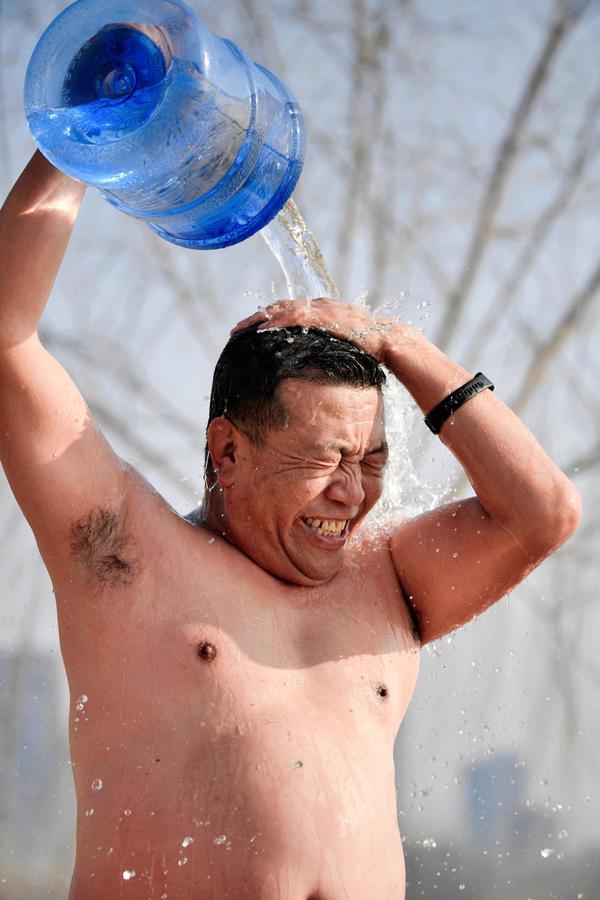 上岸后,爱好者用常温清水冲洗身体,缓解寒冷。