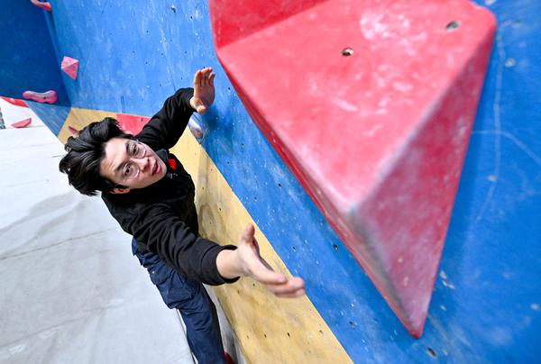 岩友相聚在宁夏亲水体育中心攀岩馆,锻炼力量与耐力。