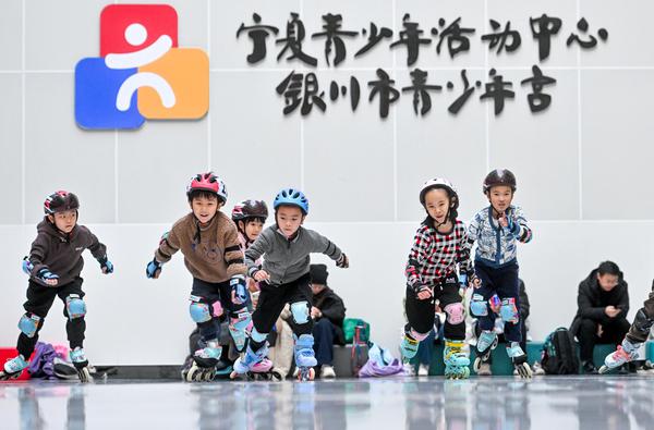 “尽量踏到头部拿三分,腿法快准狠,不要犹豫。”银川市青少年宫金凤宫,跆拳道老师指导学生训练。隔壁教室,武术、轮滑等少儿课程和普拉提、尊巴等青年夜校课程同步进行。时值寒冬,人们用运动抗寒,在趣味学习中解锁新技能。