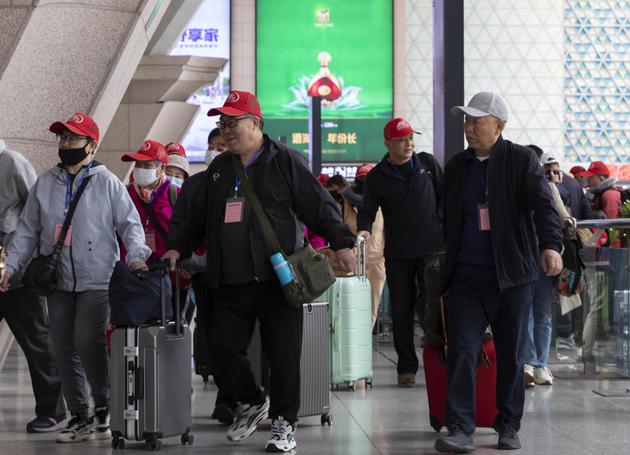 候车厅内,和曹宁生一样戴着统一的红色遮阳帽的旅客不在少数。63岁的陈胜利告诉中新社记者,自己这次是和朋友一起组团旅游,基本都是老年人,“我们40个人一个团,大家彼此都认识。”陈胜利说,自己退休金每个月5000多元人民币,“没什么负担,就想出去玩玩散散心。”