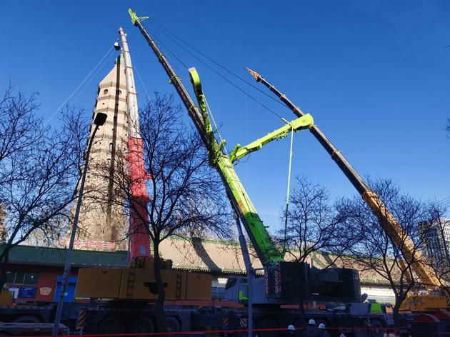 1月7日至8日,在各方力量的积极配合下,除险抢修专业队员利用大吨位吊车高空作业,拆取塔顶宝珠及松动琉璃砖块,除险工作初步完成。