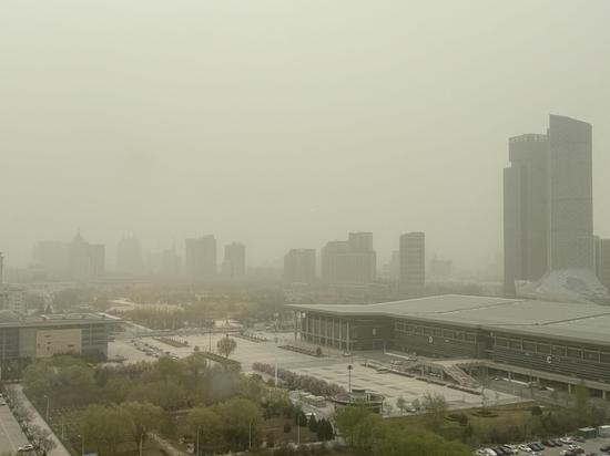 4月11日,宁夏遭遇寒潮大风沙尘暴天气,图为银川街头被沙尘笼罩。中新社记者 李佩珊 摄