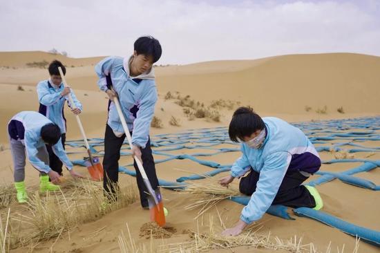 5月9日,参与“宁夏历史文化、自然资源与环境保育探索之旅”交流活动的香港学生在沙坡头景区体验制作麦草方格。(宁夏港澳办供图)