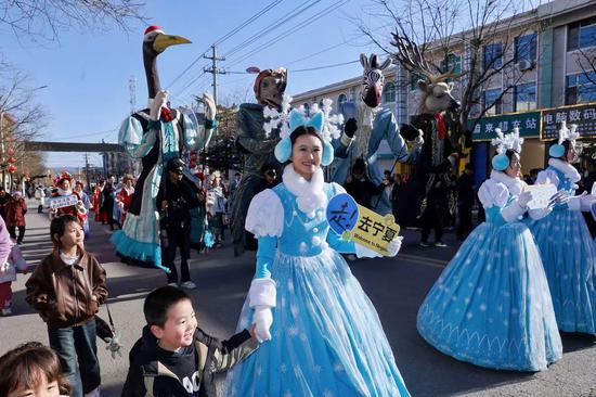 2025年12月15日,泾源县冰雪嘉年华巡游队伍走街串巷,与游客互动。 (泾源县官方供图)
