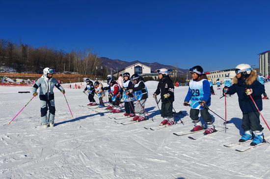 1月10日,在宁夏固原市泾源县雅豪滑雪场,泾源县滑雪队正式组建,滑雪教练带着队员进行训练。 吴文春 摄