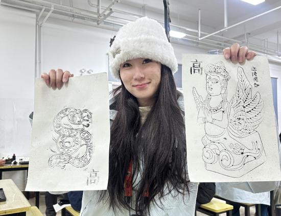 在西夏文木活字印刷体验中,营员们体验拓印西夏图案及专属的西夏文姓氏。来自台湾的高婷萱手持自己制作的两幅作品,拍照“打卡”:“蛇的图案寓意‘蛇’来运转,妙音鸟(迦陵频伽)则是西夏文化中的常见元素。”