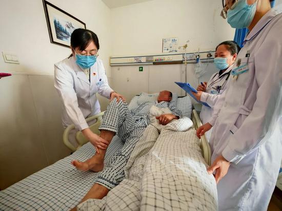 叶琳琳(左一)日常查房时对患者进行体格检查。