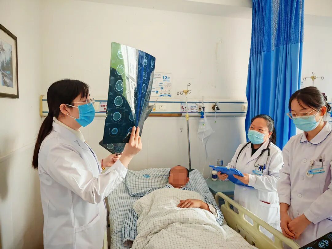 叶琳琳(左一)查房时向医护人员讲解患者头颅CT情况。