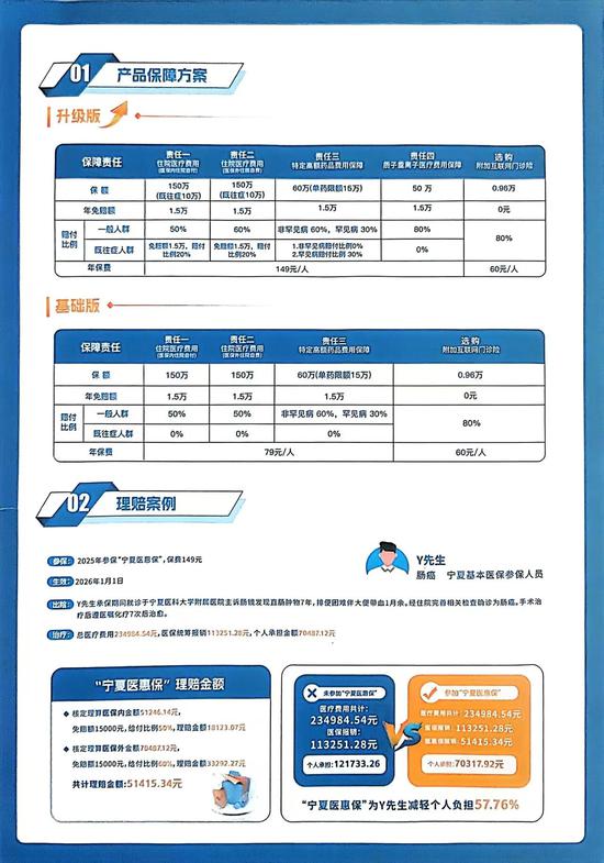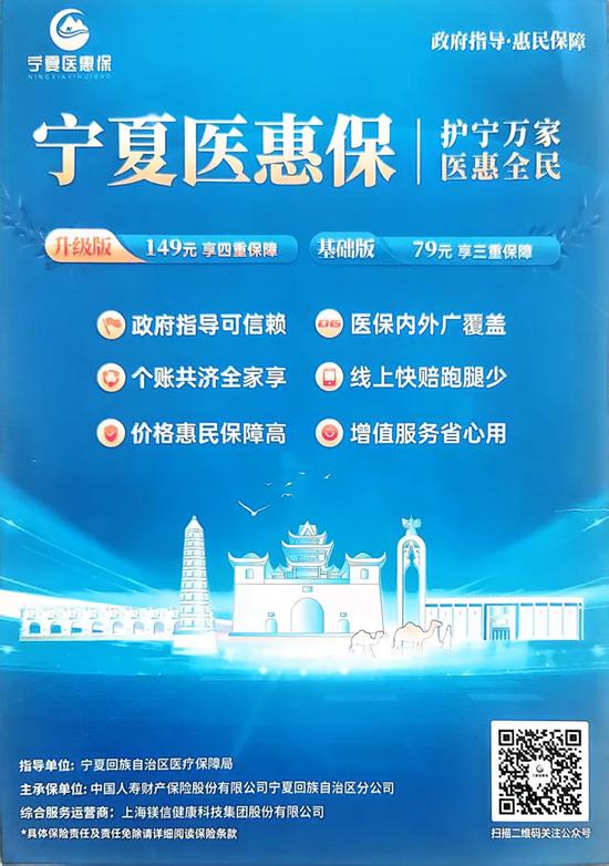 他介绍,产品参保覆盖广,不限年龄、职业、户籍、病史,无需体检,在宁夏有基本医保的新生儿至百岁老人均可参保,全面覆盖“一老一小”等特殊参保群体的保险保障需求。普惠保障高,基础版产品日均保费仅0.2元,升级版产品日均保费仅0.4元,保费低、保障高、花小钱、可负担。保险责任全,保障覆盖医保内、医保外、质子重离子医疗费用、恶性肿瘤特药责任、同时可附加选择互联网门诊购药等保障责任。