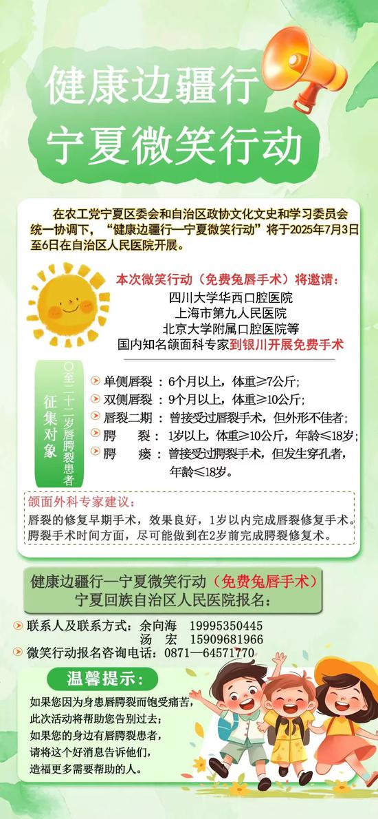 “微笑行动”是中国林产工业协会健康边疆行组委会发起的致力于为偏远地区患有面部畸形的贫困患儿提供免费手术和相关治疗的非营利性公益活动,截至目前已免费治疗了2万多名唇腭裂患儿。今年3月,在自治区政协和农工党宁夏区委会的积极争取下,“微笑行动”公益项目落地宁夏。活动启动前,自治区政协召开重点关切问题情况通报会,详细了解活动对接、工作流程、服务保障等工作开展情况,要求精准筛查、全程保障、长效管理,统筹调度场地设备、医护力量,强化服务保障。在自治区政协统筹推动下,卫健、民政等部门和市县政协,各级农工党组织联动宣传动员,共筛查出361名唇腭裂患者。活动特邀四川大学华西口腔医院、上海市第九人民医院、北京同仁医院等国内知名颌面科专家、医护人员40余人齐聚银川,4天时间将为第一批唇腭裂患者提供100余台免费手术治疗。(华兴时报记者 王 茜/文)