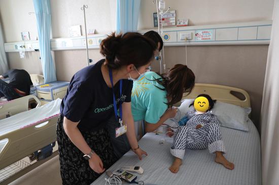 “微笑行动”专家医疗团队成员云南文山康复医院钟天航博士为患者检查术后恢复情况。